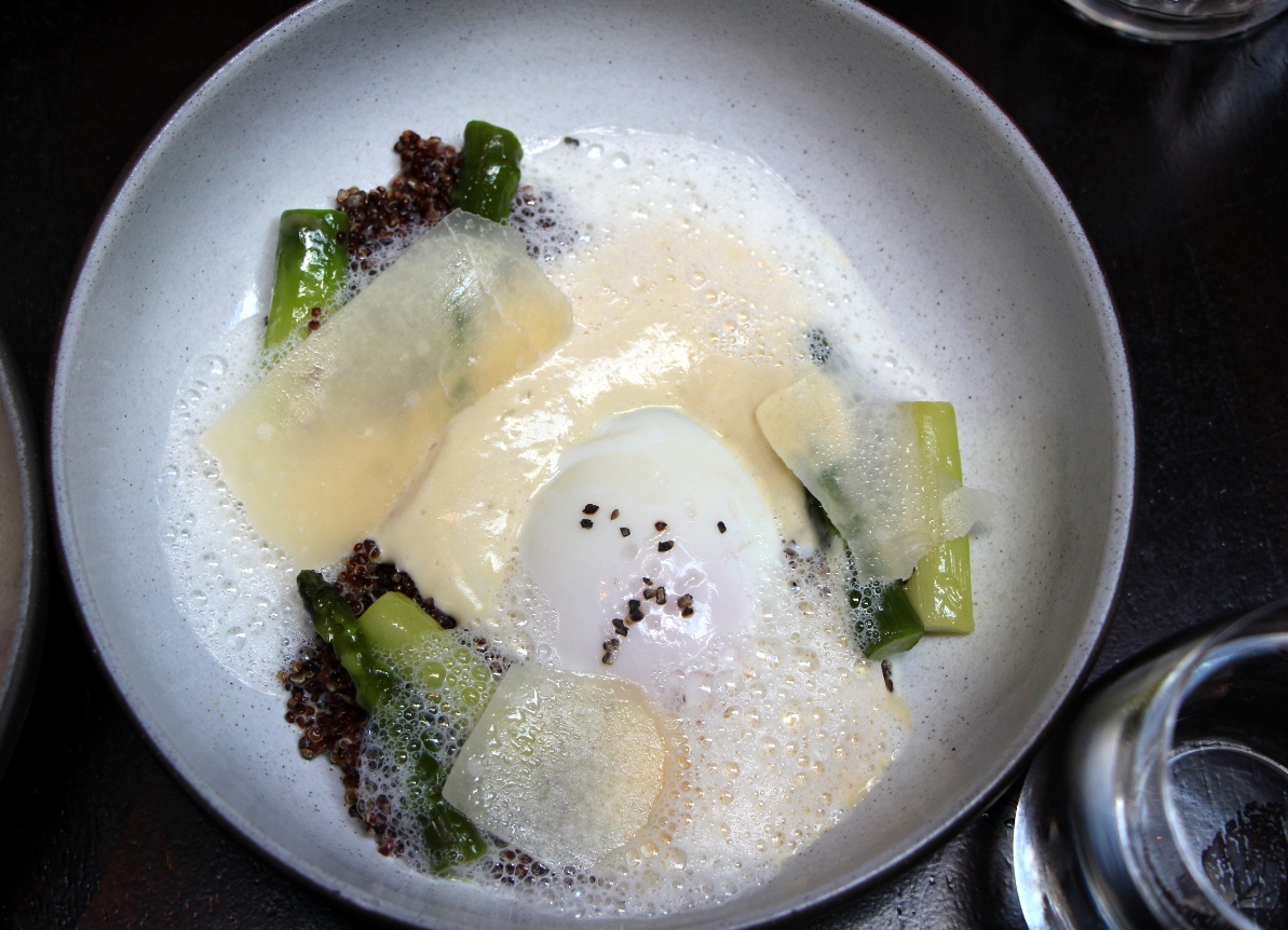 But the food was quite good. They start you off with their terrific freshly baked Focaccia-like flatbread with rosemary, sage, and a little bit of salt. Toppings change seasonally. This is perhaps as good as it gets as far as restaurant bread goes. Tagliatelle with king crab, lemon and black pepper was savory, with plenty of meaty crab to go around. But the egg stole the app show. Poached with asparagus, brown butter and quinoa, holy smokes it was good! The asparagus alone is worth the price of admission, and that grainy quinoa really tied everything together beautifully. Fantastic dish, as I say to the swedes to the right.