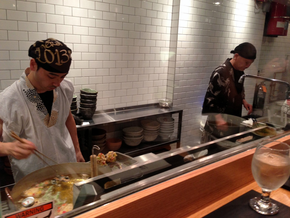 Ippudo westside has a new, modern, sort of Ramen World Epcot feel to it. “I love Ramen” t-shirts all around along with a plethora of chants. Whenever a new customer comes in, leaves, gets his Ramen, goes to the bathroom, etc, the staff chants something (eg “welcome”, “aim well”). You need to come early or late or be prepared to wait now that the word is out with the locals. They now text you when your table is ready.