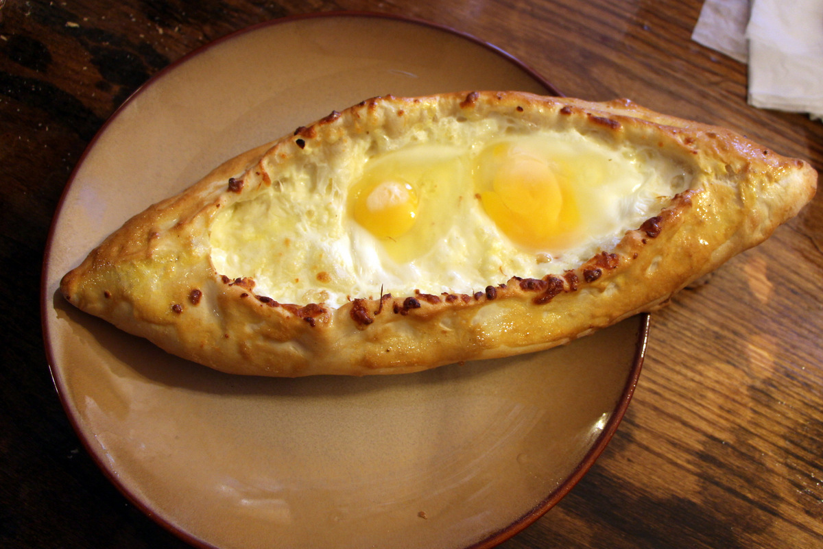The main draw here is the Khatchapuri, essentially bread with cheese which can come in various forms and sizes. But the one to get is the Adjaruli Khatchapuri, a boat shape bread topped with Farmer’s Cheese and an egg cracked open right before serving. You then mix in the egg with the cheese and the result is a gorgeous feast for all senses. The bread is hard, crispy and the perfect partner for that rich, runny mess you just made.