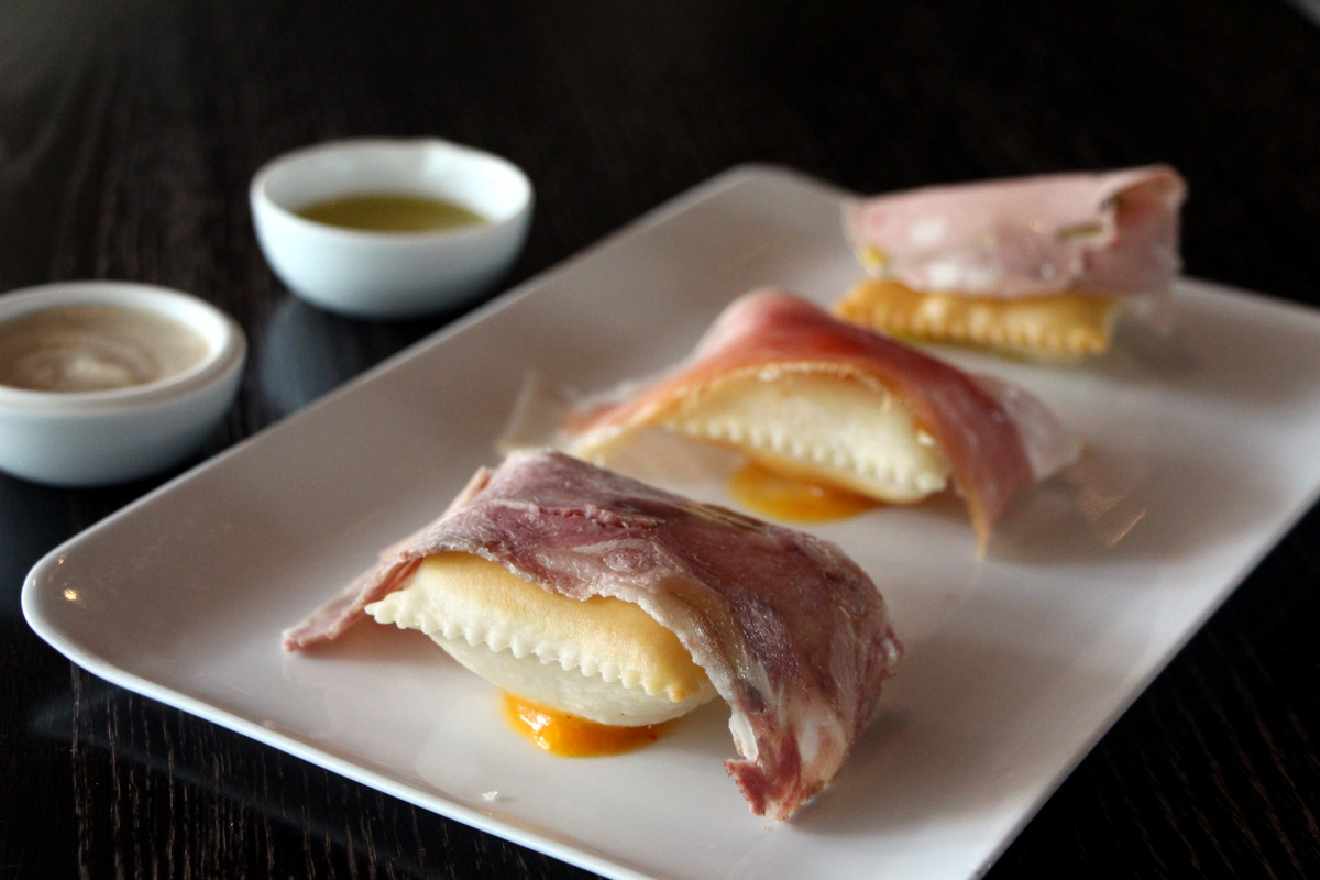 The Spongata, a superb honey and nut cake came with a satsuma sherbet that was so heavenly it could probably thrive on the dessert menu alone. Reginette, curly ribbony pasta was perfectly cooked and topped with a chunky veal, pork and beef, would most likely satisfy any Bolognese Ragu craving. A mild creamy Burrata with fava beans, peas, spring onions and a light minty sauce got a tremendous boost from the sensational prosciutto-like cured pork shoulder. The only dish I didnt quite know what to make of was a trio of Mortadella, prosciutto, and a thin head cheese slice sitting on top of a puffy fried dough on some fruity sweet sauce. Do I like it together? Separate? without the sauce? I found myself experimenting just like the chef was.