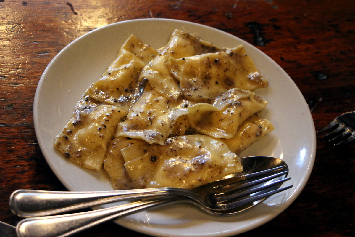 Only 14 pastas on the menu. The Carbonara here is one of the specialties. It features the 3 “P” Pancetta, Smoked Pancetta & Prosciutto with an egg that you need to mix in on your own. It worked overall, quite enjoyable actually, but not as addictive as the more traditional one you can find in Lupa or Maialino. The Black Truffle Ricotta Ravioli certainly had its share of truffle aroma and flavor, unlike so many dishes out there with the word “truffle” in it. And just when you think you’ve eaten all the pasta shapes out there there’s a Trofie, Twisty, thin, chewy little noodles, a specialty of Genoa. This one featured more truffle juice (yes please), with peas and prosciutto. By the way, did you hear the horn? Alba white truffles season is upon us, and supplies are looking good so far. Then there was the good and basic Mike Tyson’s favorite, Orecchiette with Broccoli Rabe & Fennel Sausage, and a Shrimp Spaghetti Fra Diavola consumed quickly by Dame Never Shares A lot
