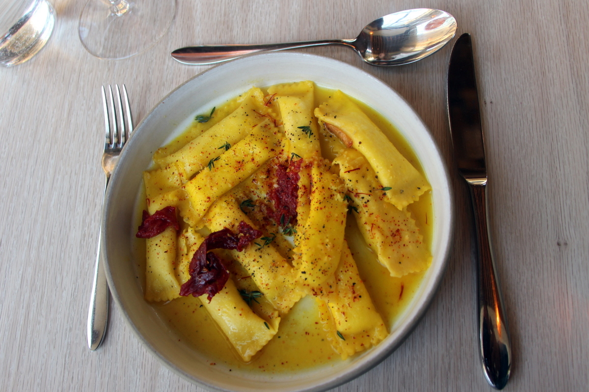 The pastas here are so good, that by the end of the meal you find yourself playing “lets rank the pastas” with your neighbors. I won! The yellowest, longest, most beautiful, straight from an orthopedic pillow infomercial, Agnolotti, filled with Sheeps Milk cheese, and finished with butter, saffron, honey, and much needed acid from dried tomato that completes the dish. At most places this would be #1. Here its #3 from the three we tried. The ‘imperfect’ Malfadini looked and tasted pretty perfect to me. Take your average Cacio e Pepe, change the pasta to something with more texture, sharper cheese like Parmigiano Reggiano, and pink peppercorns, and you essentially got Cacio e Pepe on crack cocaine. And then comes the tomato-less Pappardelle with veal and porcini ragu. Quite a contrast and an upgrade over other such ragus all over town, one of which by Via Carota I’ve had days earlier. What a difference. Its all about the slow braised meat and its juices, reminiscent of the Ostera Morini meatless Stracci with mushrooms.