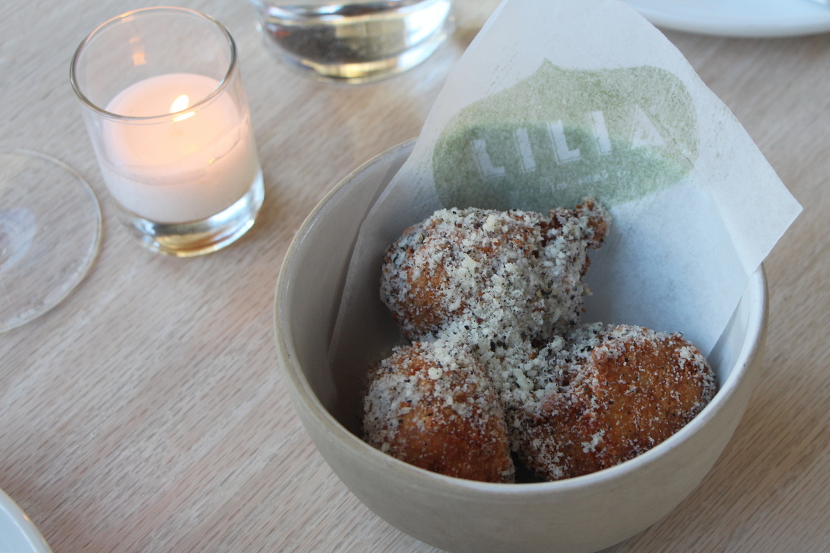 Lilia delivered the type of meal that almost makes you want to move to Williamsburg (Parking, and lack of reliable auto shops stand in the way). Although my team of critics and I had to wait a month to score a table (damn you Hot Lists and all your informative wisdom), the initial feeling upon enetering is that of a comfortable neighborhood spot where you just want to hang on a Sunday night. Roomy, bright, high beam ceilings, and did I mention roomy? A luxury these days in North Brooklyn and Manhattan. Even when you consider the number of employees almost match the number of diners, no one is on top of you, and the space makes you want to get up and run around, with scissors, naked (I’m seeing someone about that)