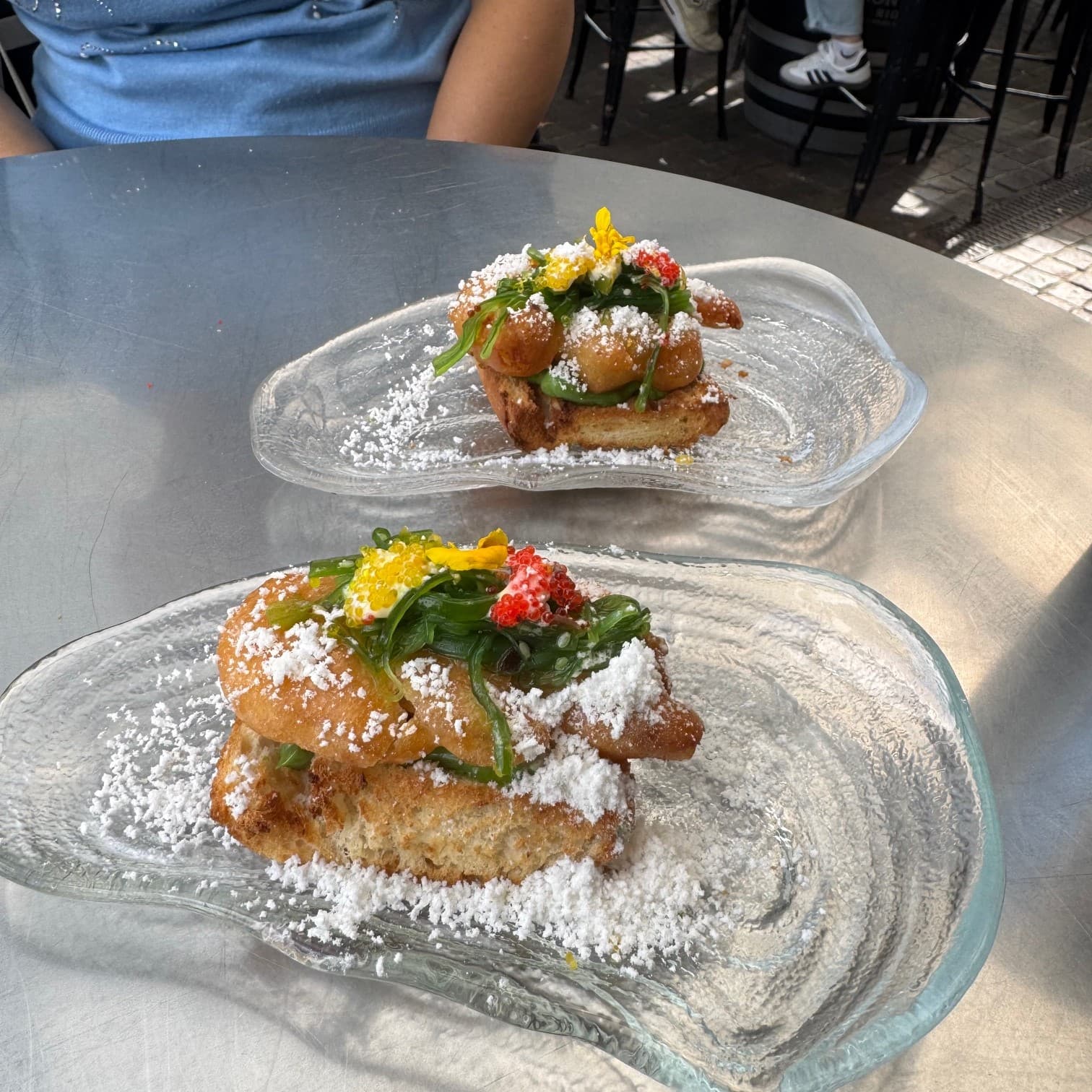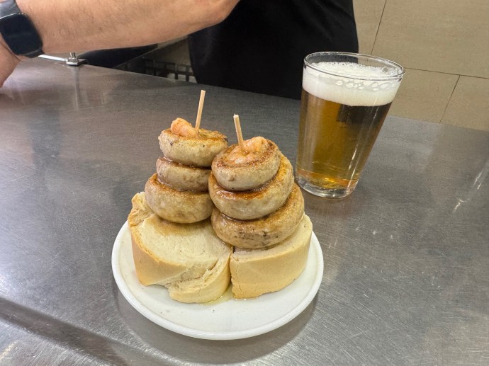 Bar Gran Sol is a multiple Pintxo award winner, and one of those awards is the sensational Mika. Shrimp and bacon in beer tempura and other goodies on an onion toast. Named after the cook who created it. While the egg mollete gets much of the hype here, the Mika is the one to get, along with the BBQ Rib. Come before they open for a drink and a table, otherwise risk long lines.