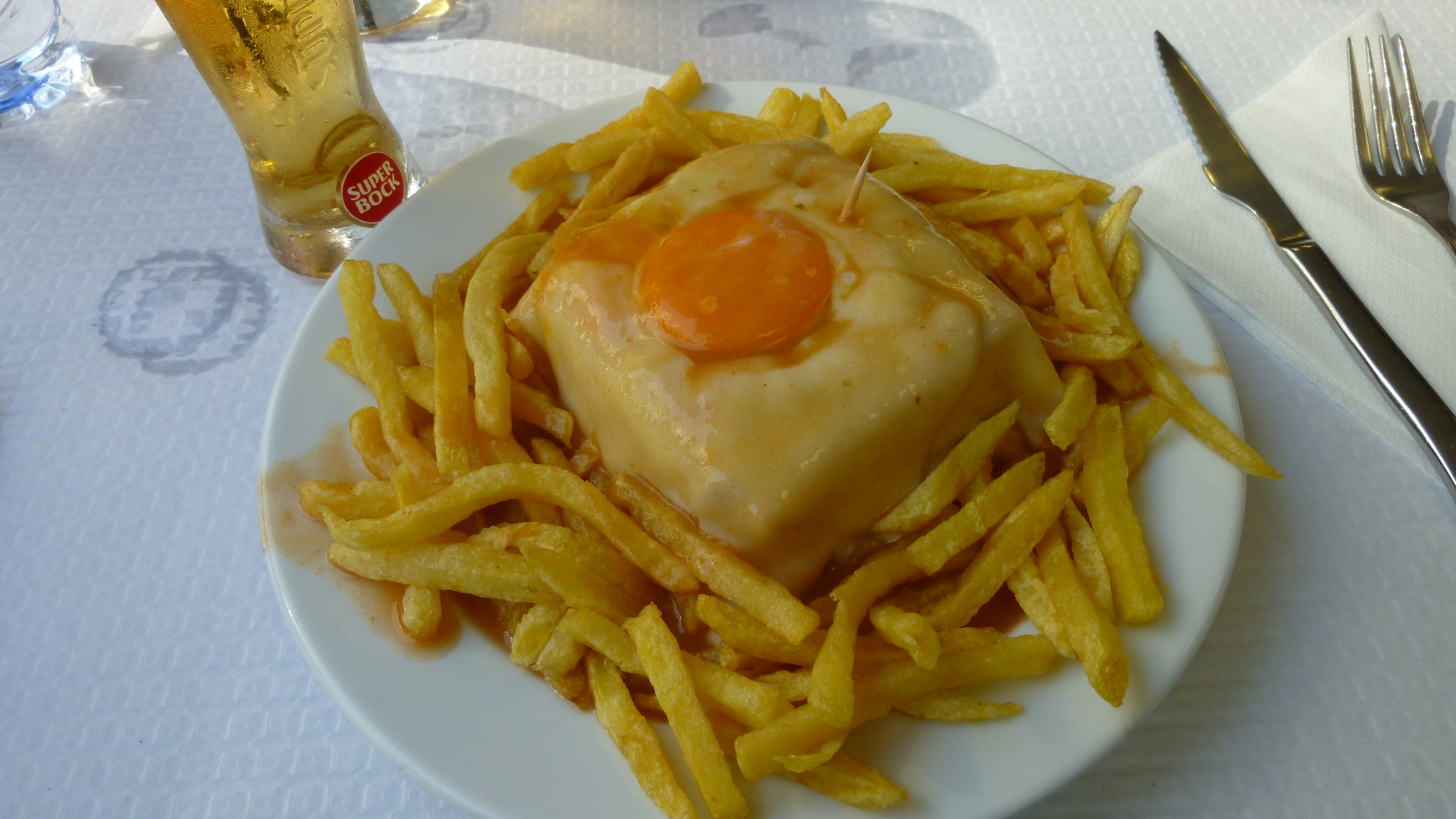 Inside the Francesinha It is a sandwich made with ham, 2 types of sausage, steak and served with melted cheese and some secret beer-base sauce. You can order it with egg or not. It was created by a Frenchman trying to adopt the Croque-monsieur in Portugal, hence the egg and ham. But it’s all about the sauce, which you can barely see here (it’s the yellow stuff – click on the picture to get a closer look) with each restaurant trying to outgun the rest with their homemade sauce.  Perhaps the greatest sandwich I’ve ever eaten.