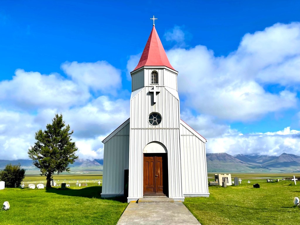 Hofskirkja church – turf covered roof and unique cemetery. The last turf church built and one a few remaining