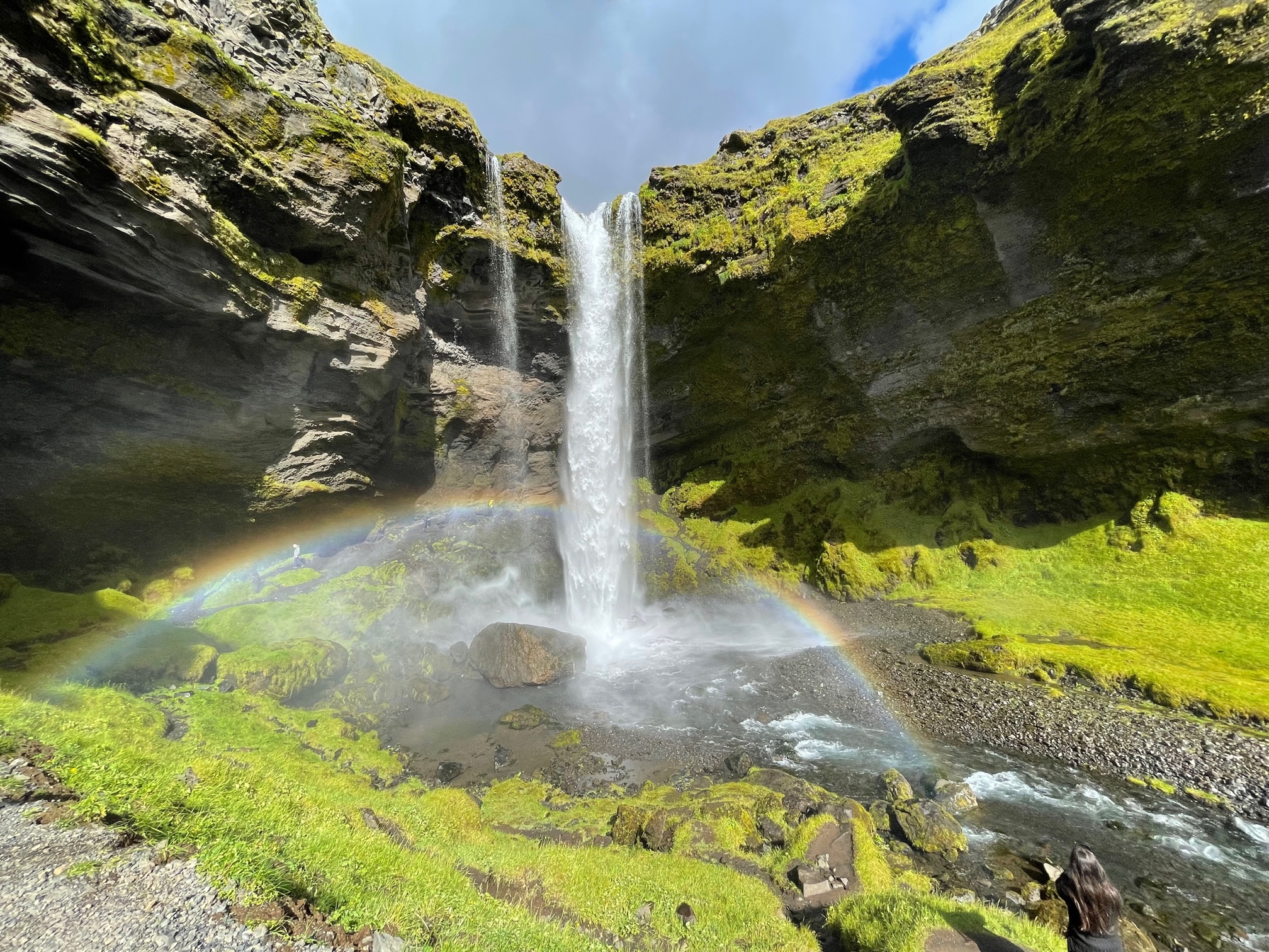 Kvernufoss – park at Skogar museum, 10 minute walk to the falls, waterproof clothes if you opt to go behind the fall. Rainbow if sunny