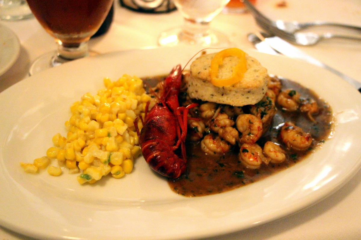 Started with a terrific duo of soups. A very dark and satisfying seafood gumbo, and an even better butternut shrimp bisque that turned my little one into a bisque junkie/critic the rest of the trip. The bisque was creamy, not too sweet, and had just enough pleasant heat to balance things out. Shrimp Remoulade with Guacamole, Deviled Eggs and a surprisingly scrumptious corn relish was a nice medley of flavors and textures with the mustardy Remoulade at the helm. The crawfish shortcake with peppery étouffée and corn was equally enjoyable.