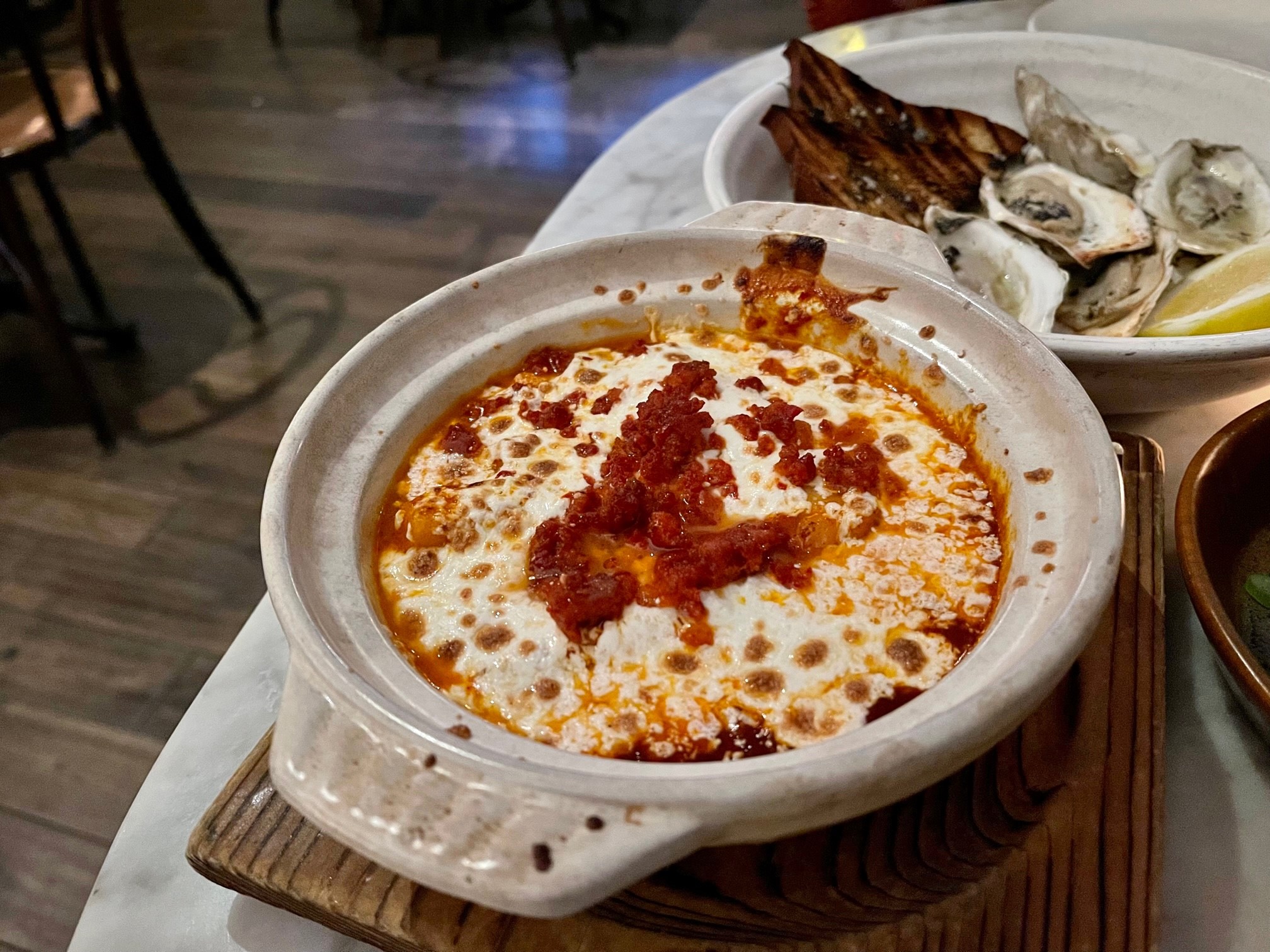 Dukboki – fundido saucy & spicy rice cake, chorizo, Oaxaca cheese. Probably our favorite dish of the night. Mexican, some may even say Staten Island inspired (bakes ziti, a SI staple) but unmistakable Korean flavors. Best part is the Oaxaca cheese soaked (eventually) in all that chili.