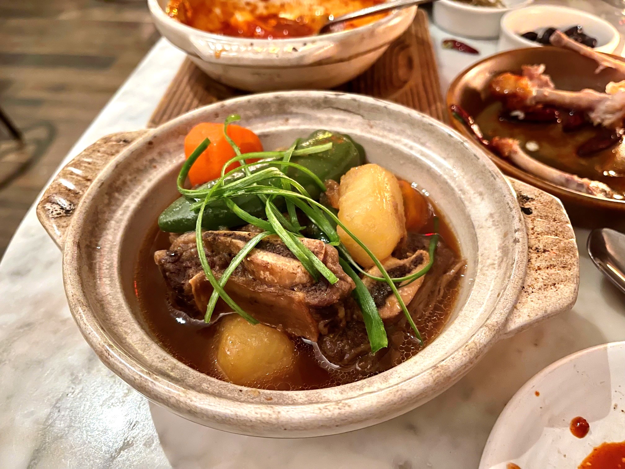 Kalbi jjim – beef short ribs, carrot, jalapeño. Supremely flavorful, tender short ribs in a thin broth. Served with plain dry white rice for some reason, but still an enjoyable dish.
