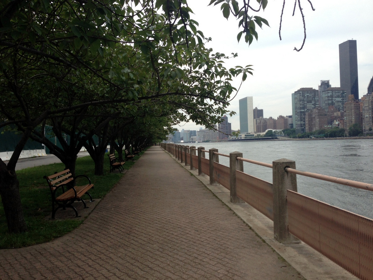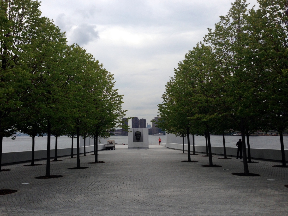 We now head North to the romantic portion of the trip to 60th, riding entirely on 1st ave which has a great bike lane btw.  Both of us making it to Roosevelt Island for the very first time.  I always thought I would make it with Mrs Ziggy one day, never with the romantically challenged Hummus Whisperer.  It took us about 30 minutes of aimless walking and some bus shuttle hopping to nowhere to realize that god invented Google for a reason.  Apparently we need to head to one of the ends, the closest one.  So we head south and now I see what the hoopla is all about.  Nice park along the water, another park, NYC’s only monument ruin (an old smallpox hospital), and right on the tip, FDR Four Freedoms Park.  This is got to be one of New Yorks most stunning parks, and what a setting.  FDR’s huge bust overlooking the island brought me back to my old FDR high school in Brooklyn where I learned how to write properly (you guessed it, the school is now closed!)