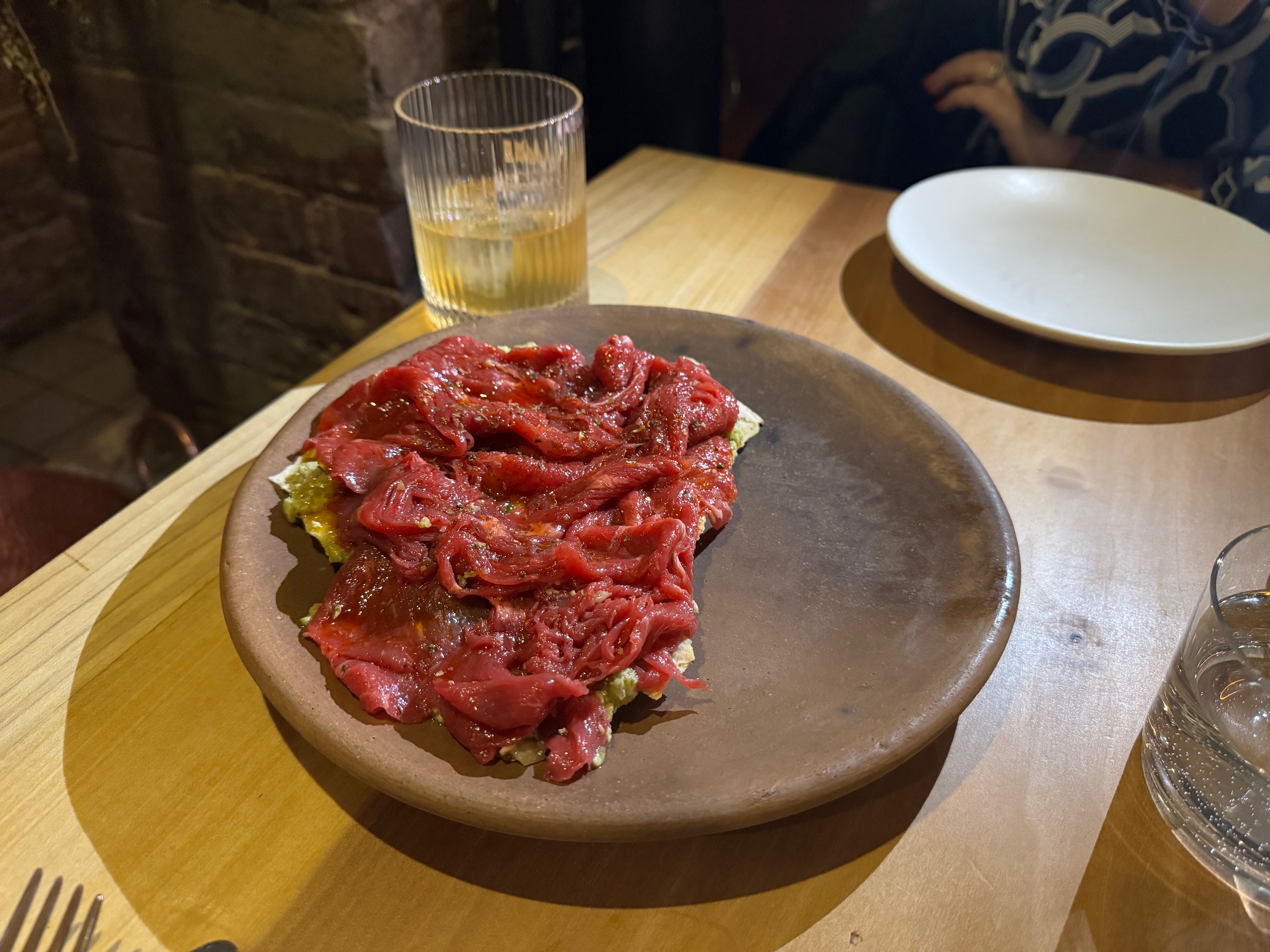 Beef Cecina Tlayuda – Superb cured beef. Like a moist beef carpaccio. More of a sum of all parts situation with the crunchy tortilla, Edamame Guac, and a sprinkle of Chapulines (Grasshoppers) so you dont forget where you are. Decent size for a small dish.