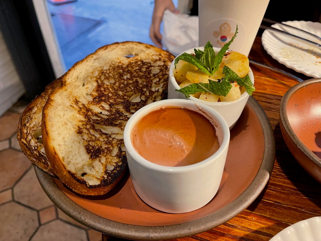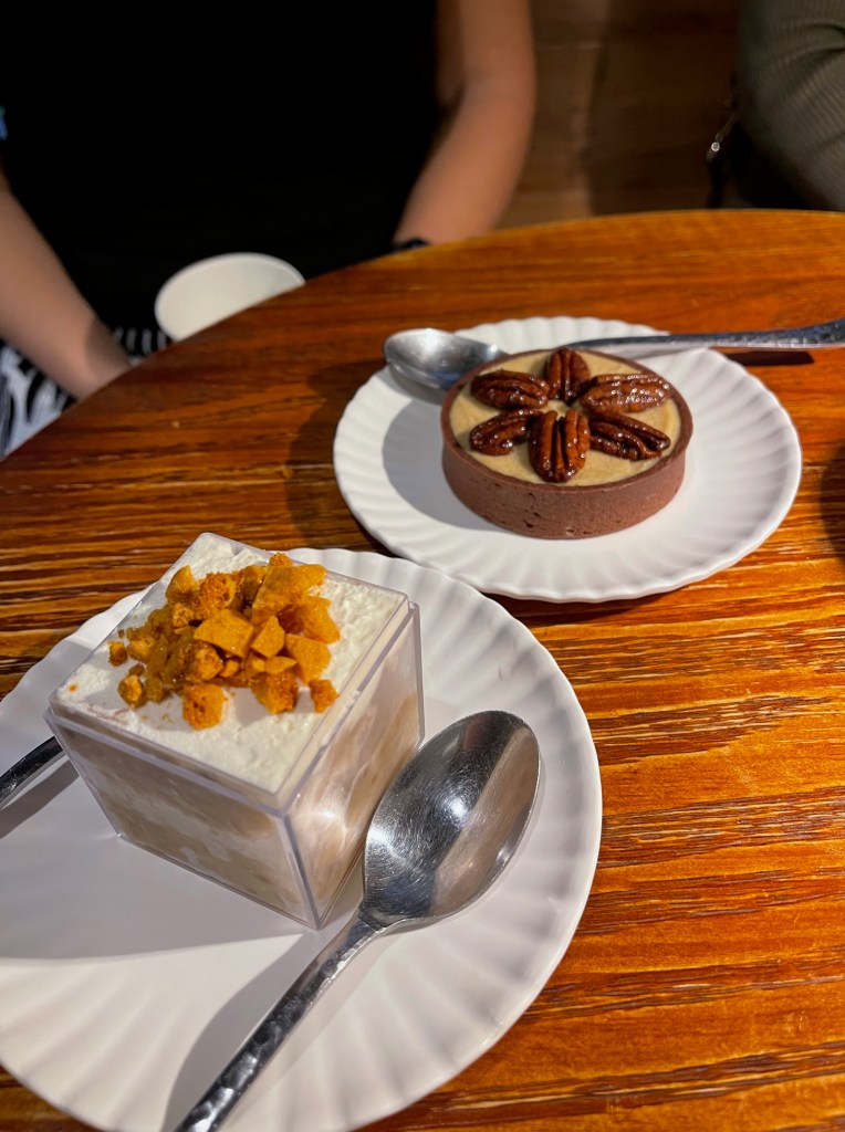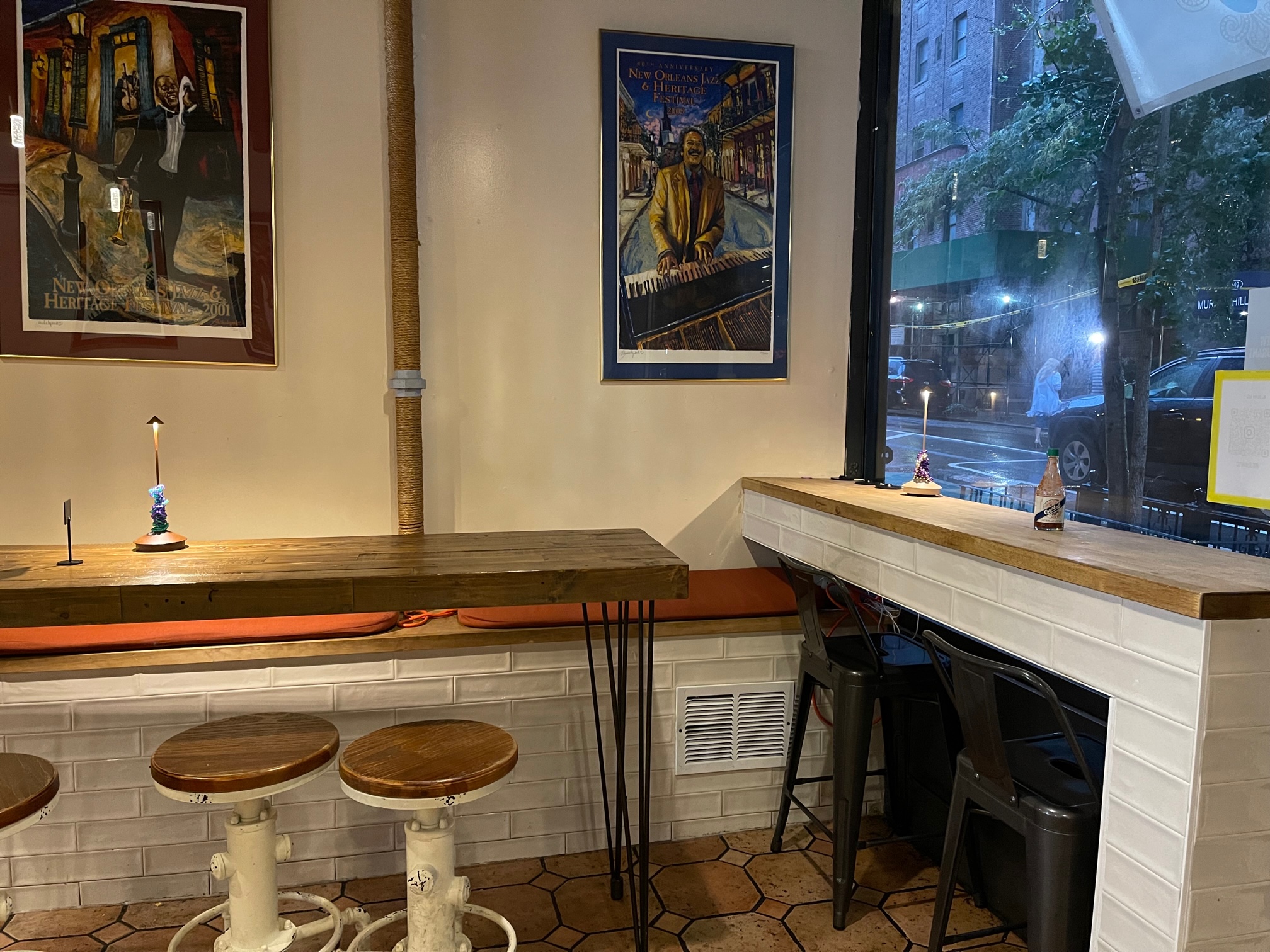 We also enjoyed the cheesy grits with Andouille. Quite sweet for Andouille but it worked. For dessert we much preferred the Dalgona Banana Foster over their version of pecan pie. Think a Banana Foster and Tiramisu love child. You also get a free delicious probiotic drink at the end, and a welcoming starter bite at the beginning to get the juices flowing. Everything about the place is quirky including the stools.