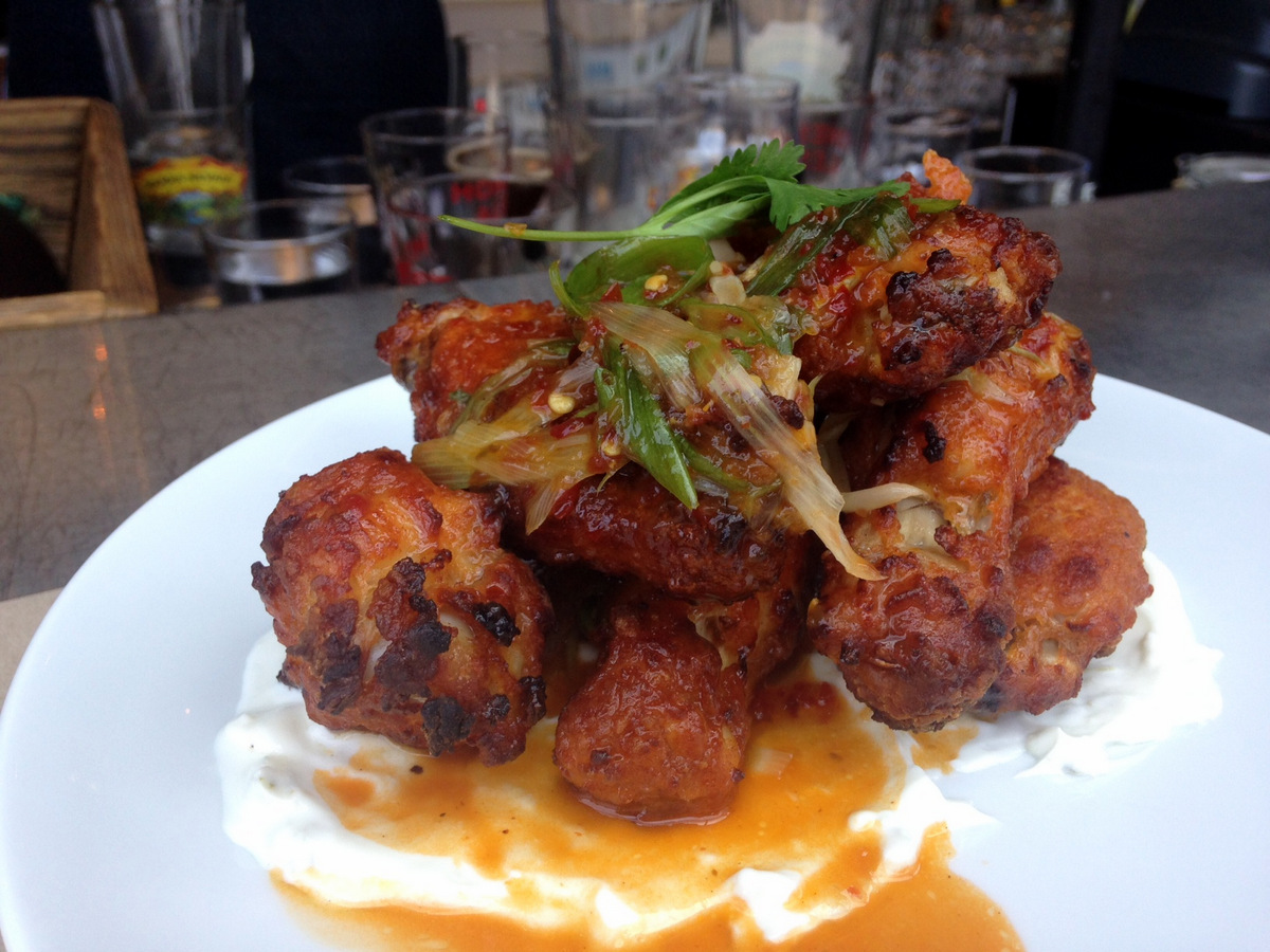 The Cannibal (Gotham West Market) – Chili and Garlic Wings.  These wings dont carry the same spice punch as the others.  They are milder, but far from lacking in flavor.  The wings are marinated, slow roasted, and breaded before cooked in the Cannibal’s high powered oven.  Kitchen space is limited in Gotham West so they need to be creative.  The zesty aioli and the little oniony salad served on top compliment nicely.  And the skin and the juicy meat are happily married.  And dont forget about the sick Pig’s Head Cuban.  This is quickly becoming my favorite Gotham West menuCanibbal - wings