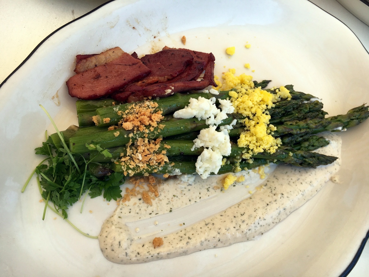 Something tells me the food is better than this.  I’ve been to the Grand Banks before for the coveted lobster roll, but this time we came back with another couple for lunch.  The menu consists of seafood driven small plates ranging between $15 – $28.  The more expensive items like the pictured three piece Tilefish is still considered a small plate by all measures.  The fish was cooked well, but did not offer any distinct flavor.  The Ceviche this day (it changes based on market availability) featured slices of scallops that lacked any sort of oomph, and were rather limp.  The asparagus was perhaps the surprising highlight after the roll.