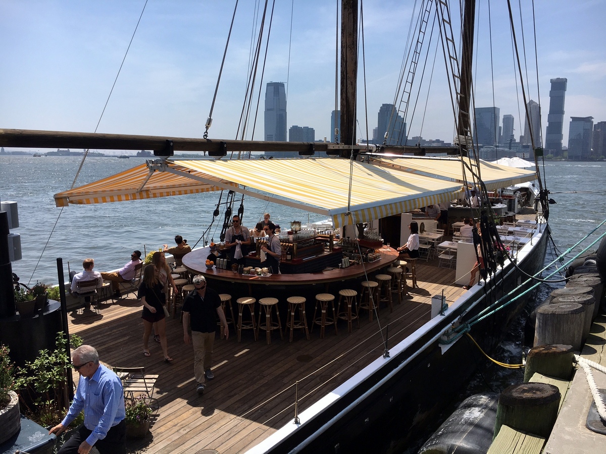 Someone asked me recently to recommend something for a couple in their 30’s on a first date.  30 minutes and 20 questions later, I recommended The NoMad Bar, Santina, and The Grand Banks, a schooner (boat) docked on the tip of pier 25 in Tribeca between May and October.  Albeit, this was before my recent meal there, though my confidence in the place wasnt exactly shattered.  The Grand Banks is the kind of place you want to take everyone.  Friends, neighbors, co-workers, work neighbors.  In My office floor, there are two companies, and you can easily distinguish the two when you visit the man’s bathroom (maybe the female too, who knows).  While we go in and out and do our business as quickly and clean quiet as possible while playing Doodle Jump, the other office members like to chat to each other, and wheel and deal while sitting in their stalls.  Yes, those guys especially would enjoy the Grand Banks.  But I cant picture them enjoying the stalls there nearly as much
