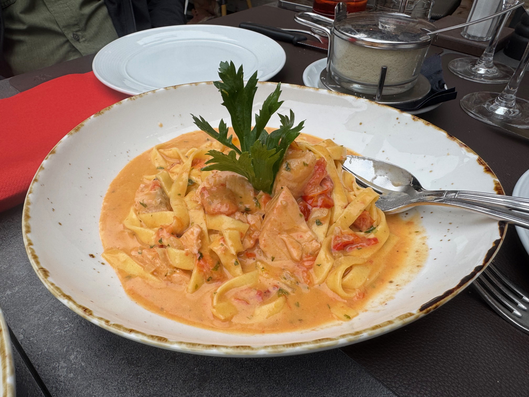 On both nights we enjoyed their exceptional soups, especially the creamy herb soup. And on both nights we enjoyed their superb salad. The older I get, the more I appreciate a good varied salad. A special of Halibut one night, was expertly cooked. A saddle of Lamb on another was another flavor packed winner. Tagliatelle, one of their specialties was fine, not great, but the kind of dish we appreciated after eating so much rustic fair.