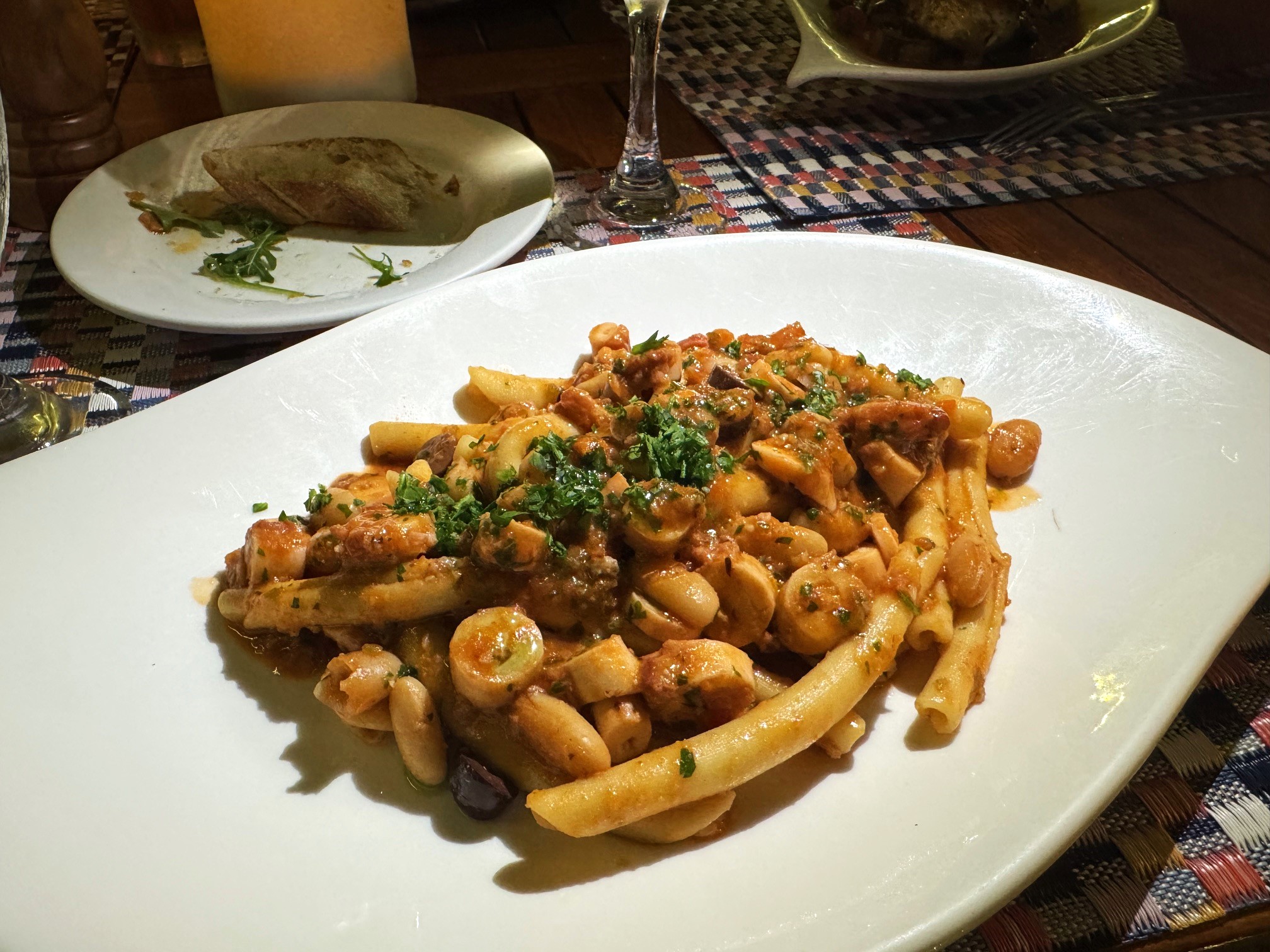 But there’s no shortage of hits. On our first night we discovered a well crafted Duck Foie Gras terrine. The Gnocchi is still the same fresh pillowy goodness. The conch chowder is as good as ever, and the Lobster fra diavolo is still a crowd pleaser. Pay attention to the specials. They may include a fresh Wahoo perfectly cooked on top of an addictive Amalfi style veggie stew. Or a beautiful chewy Strozzapreti with bits of octopus, beans, olives, tomatoes and more. Strozzapreti of course was created when someone saw a priest being slowly strangled. On our second night we came with local friends, so we were able to sample all the specials.