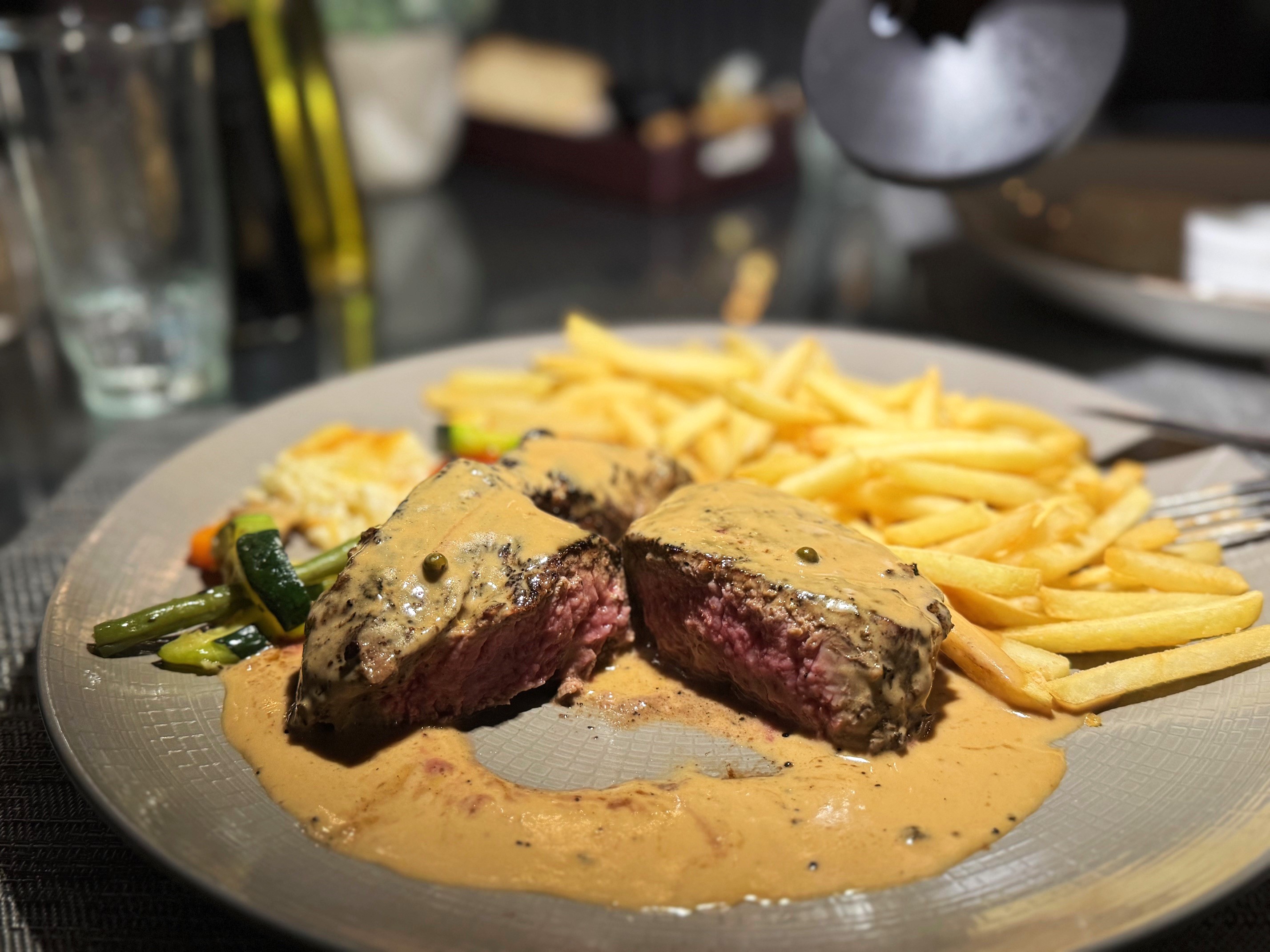 Another stellar meal. Killer Escargot as usual. Perfectly tender octopus sitting on a nice and crunchy salad. Love salads with texture. And I can’t think of another signature dish on the island that’s more renowned than the Steak au Poivre. It’s the sum of all parts dish including the fries, au gratin and veggies. Highly recommend Le Bouchon, for like the 25th time.