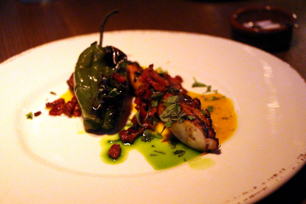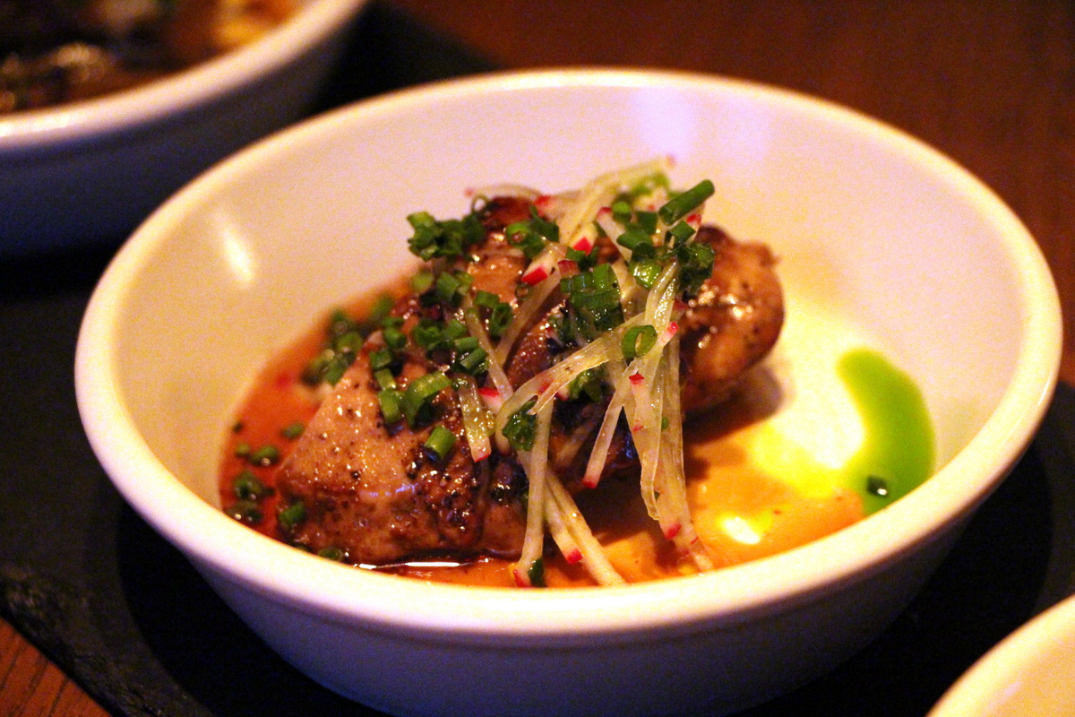 Gato - duck liverAppetizers– Expertly cooked oven roasted Shrimp with Diavolo oil, garlic chips and chile that provided a nice punch.  A notch above the average Gambas dish at a tapas joint near you.  Octopus was quite scrumptious and when you get it as tender as this, its most enjoyable.  The pungent green pepper and salty bacon bits just added to the joy.  Pizza with lamb sausage was just a good pizza with lamb sausage, missing the drama of the other dishes.  Perhaps losing to Giove is still not sitting well with Flay.  Dish of the day nominee… Scrambled Eggs! A Revelation! Almond Romesco (spanish red pepper sauce), Boucheron cheese, super fluffy eggs… what a combo. I suggest trying this without the accompanying oily tomato toasts which have no business being there except to complete the otherwise naked dish