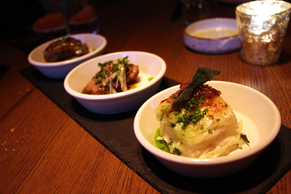 Bar menu — Pick 3 for $17.  The 11 layer scalloped potato and the duck liver were quite delectable, but the Eggplant with Manchego and Oregano solidly triumphed above the rest.