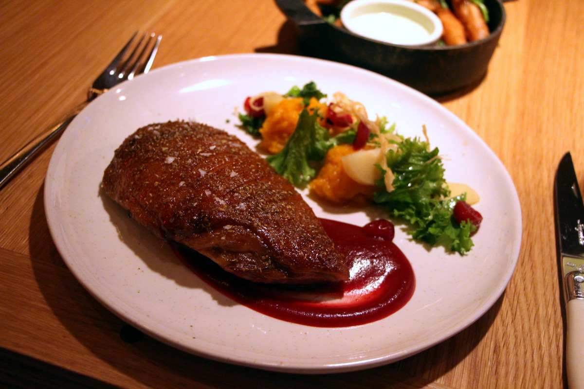 The two mains were far less thrilling however.  The duck breast was lacquered, undercooked (for my taste) on the rare side, covered by a thick fatty layer, with cranberry sauce.  Just didn’t care for the overall texture and flavor.  The best part was the gingered butternut squash on the side with spiced cranberries.  Should have ordered the much better looking lamb loin.  We expected much more from the “whole” Branzino, filleted and topped with a salad that included fennel and onions that were somewhat off-putting to Mrs Ziggy.  Dried up fairly quickly by the time I got to it.  A rarity for us as we prefer the simpler way we grill them at home, with the bones and skin and all, lemon and olive oil.  Carrot fries tempura style side was the saving grace of the mains.  Just get all the carrot dishes here.Narcissa - Duck Narcissa - Branzino