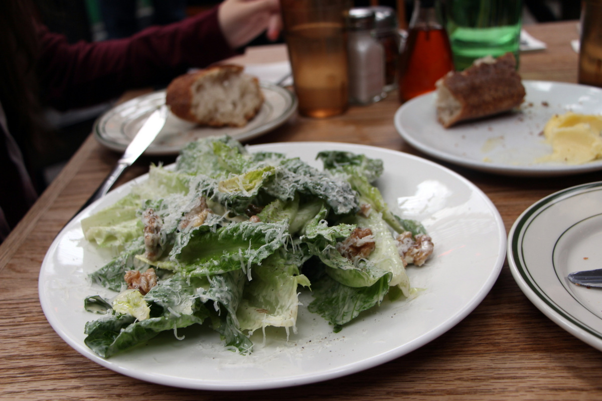We started with a salad, which turned out to be $5 more expensive since in true a la carte fashion, the bread and butter is a menu item. This is a New York trend that I hope reverses soon as I didn’t find much wrong with the concept of receiving the bread and butter for free. Here, you expect to get something that resembles this, but instead you get something that you normally get for free elsewhere, albeit a nice warm baguette and butter that was a little oversalted. The Romaine “I cant believe its not Caesar” Salad was as good and fresh as Romaine Salads can get, with candied walnuts, Pecorino and mint.