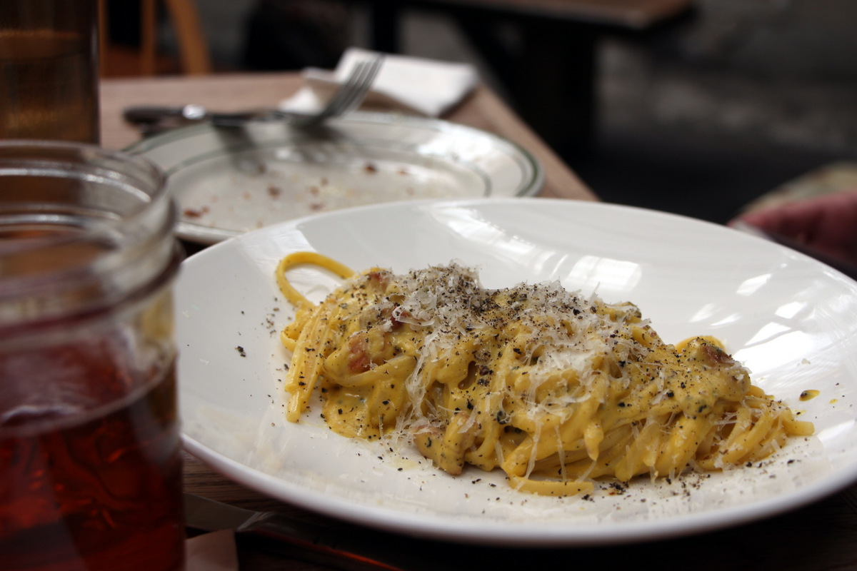 Ribs or Carbonara? Ribs or Carbonara? “We are out of the Ribs”. That settles it me thinks. The Carbonara arrives looking nothing like traditional Carbonara, and more like some heated yellow mess, was surprisingly quite delicious. The Guanciale was missing its snap, but the pasta was peppery, eggy and rich. We attacked this thing with full force. The pizzas were the same classic Neapolitans we’ve been enjoying for years. Margherita was perfectly light and airy, and so was the busier secret menu item Bee Sting with the honey and Soppressata. Try it at a food festival near you, or take the schlep over the bridge and then some